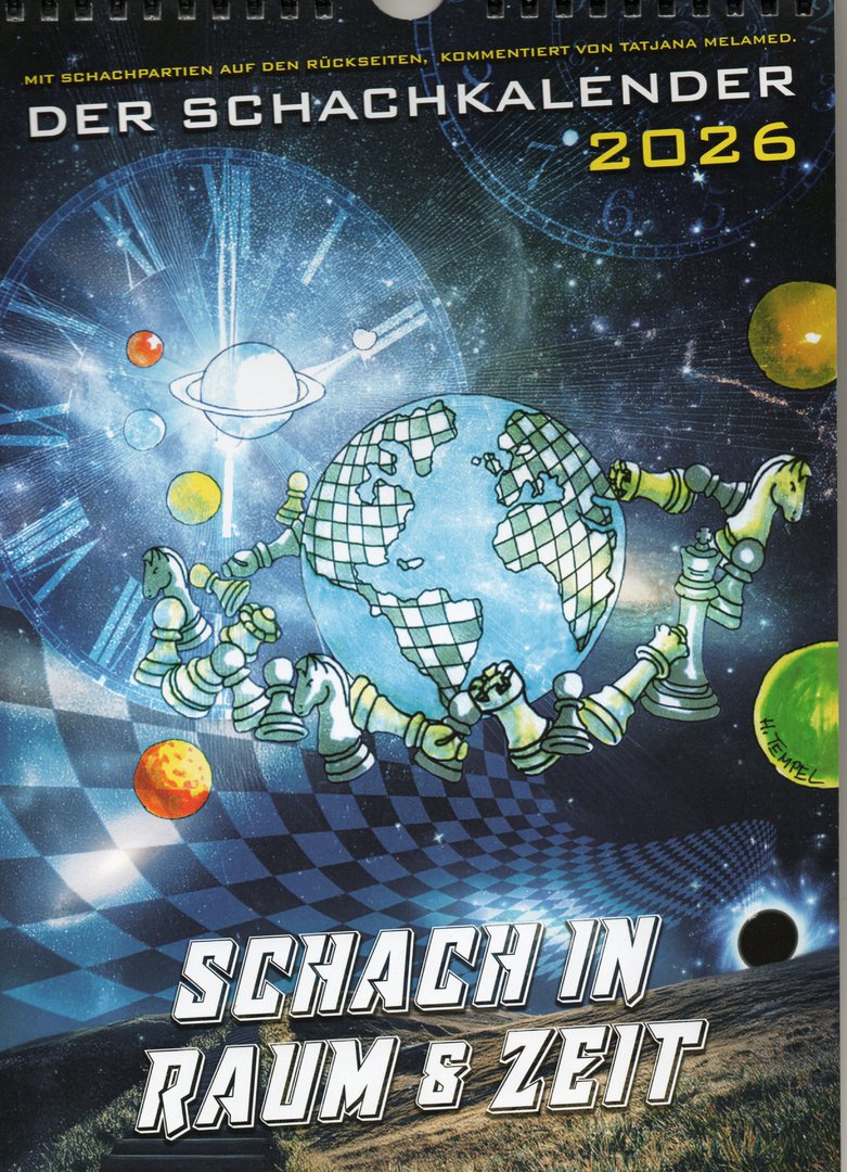 Der Schachkalender 2026 hat in diesem Jahr das Thema „Raum & Zeit“ (Zeichner Hans Tempel). Dazu kommen, in gewohnter Weise, auf den Rückseiten, interessante und kommentierte Partien von Nationalspielerin Tatjana Melamed der DJEM in Willingen 2025.